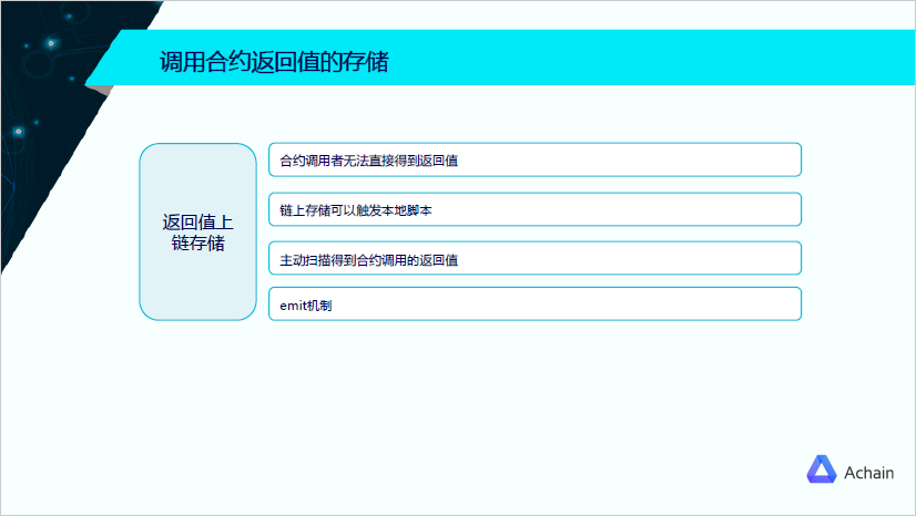 我们采用把返回值也上链。在本地写一些脚本,这些脚本接收链上的信息。当返回值上链,本地同步到这个区块,解析以后发现有关系的返回值,调用本地的脚本,间接得到返回值,这就是PPT第三个描述的主动扫描得到合约的调用。