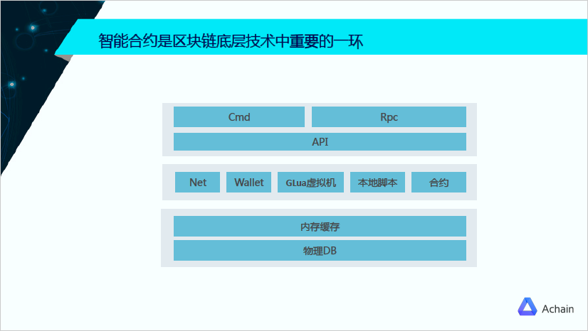 Achain最上面是接口层包括CMD、RPC和API,中间是逻辑层包括NET、wallet、GLUA虚拟机、本地脚本以及合约,构成Achain的业务体系。其中虚拟机、本地脚本以及合约这三个部分构成了Achain智能合约的体系。我们的虚拟机是基于LUA智能合约编写的,在里面进行一些改善来适用。下面是存储层,包括内存缓存和物理DB。如果Achain上运行的是智能合约,就会启动GLUA虚拟机进行计算,计算完成之后,存储到里面。