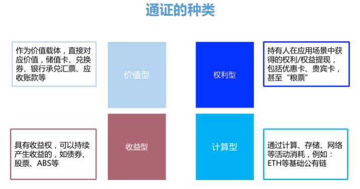 第一种类型我把它称为价值型,此时此刻有一个现价,比如,储值卡,兑换券,银行承兑汇票;第二种是收益类,比如:股票、ABS。第三种,权利型,它是社会共识之间一种主观的认定,比如VIP卡,持卡人消费能打折,这是一种主观的权利,也是社会共识。年龄大一点的人都知道我们国家曾存在粮票,这是因为计划经济时代粮食紧缺,限制消费的能力,这也是一种凭证。第四种是计算类,例如以太币,是通过计算成本来衡量的。这种模式很独特,他没有特定的价值背书人,这也是技术共识导致社会共识的一个典型。
