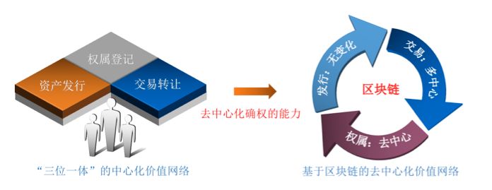 因此,我本人长期对区块链的定义就是——“数字资产的去中心化价值网络”,它把过数字资产的发行、登记和转让这种三位一体的中心化的价值网络改变了。因为资产可以登记在链上,所以它让我们的发行可以跟原来保持一致,它的权属的登记可以实现去中心,从而交易可以实现多中心,就像刚才说的上交所和纽交所本质上可以交易同一支股票,要比你用CDR的方式发行同一支股票要有利的多。区块链完成了数字资产的去中心化登记,因此创造了无尽的可能性。