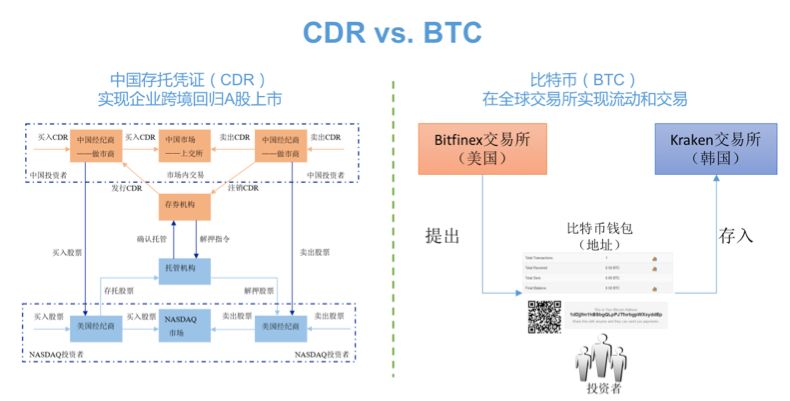 大家可以看到这张图,从流程上,CDR要经过无数的中介机构的转换,把它从纽交所买下来,然后把它存在那里,告诉大家说我没有去卖,这样就可以在中国发行等值的股票。一定是有跨境的能力的机构,才能实现这一点,细节我不说了,流程很复杂。我们再来看比特币,全世界的交易所有上千个交易所,不管这个交易所横跨哪几个国家,我如果想换一个交易所交易,不都是进行提币和充币吗?