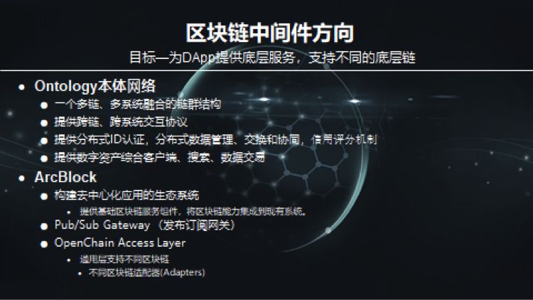 传统中间件提供的是一个把底层功能通过简单易用的方式提供给上层应用的中间层。这个概念用在区块链上,就是上层应用通过中间件来打通不同的区块链底层,这里面有些比较典型的例子,本体区块链就是类似这样概念。