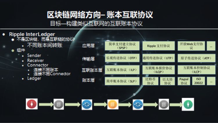 瑞波提出InterLedger账本互联协议,从协议的角度来构建账本的互联网,互联账本。InterLedger可以用来构建开放的不同区块链上的资产转移协议,甚至也可以用来构建区块链账本与非区块链账本之间的资产转移协议。