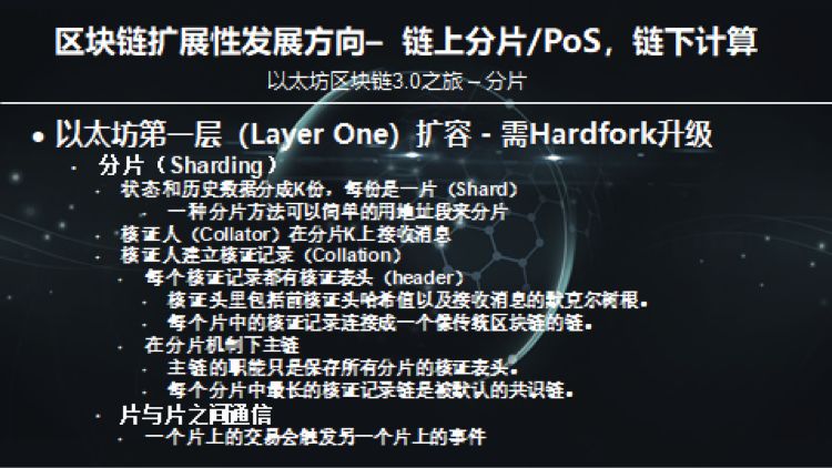 而另一方面,以太坊也不甘落后,从多方面开启区块链3.0之旅。总的说来,它通过两类扩容机制。第一类也就是平台核心扩容,叫第一层扩容,这个需要hardfork硬分叉升级。这个包括Casper共识算法的引进。Casper第一阶段将在目前PoW的共识机制加上POS,把它变成POW和POS的混合,也就是说每100个区块中,前99个仍然采用PoW机制出块,第100个采用PoS出块,并最终确认前100个区块的交易。