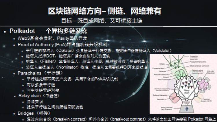 由Blockstream提出的侧链概念,也是基于在不改变主链架构的前提下来扩展主链功能。例子像Rootstock,它既支持与比特币的双向挂钩,也支持智能和约,而且兼容以太坊的智能和约。而以太坊黄皮书作者Gavin领衔开发的Polkadot既自成一区块链网络,又可以作为侧链去桥接像以太坊这样的主链。它有多条平行链,和一条中继链,组成自成一套区块链网络,其中平行链之间的跨链经由中继链来实现。而桥接则是一种桥接主链的侧链机制。