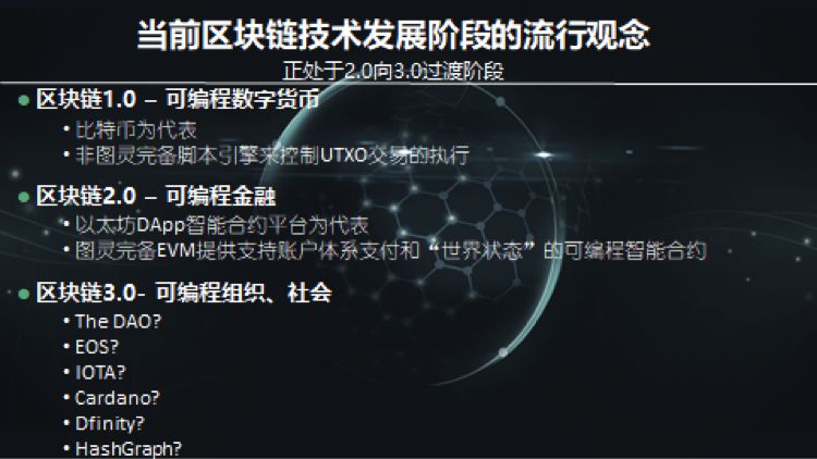 区块链2.0,可编程金融。以以太坊为代表,提出图灵完备的智能合约平台,不单管理账户体系支付这样的状态,还可以包括“世界状态”,你所有能想象的状态都能支持。架构往前迈了很大的一步。现在也是因为迈的步子太大出现很多问题。但我们人类的需求是无止境的,2.0没做好,很多人已经开始想3.0。