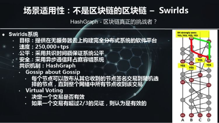 另外一个比较新的Swirlds Hashgraph也是完全不同于区块链的结构,有着非常独特的共识机制。