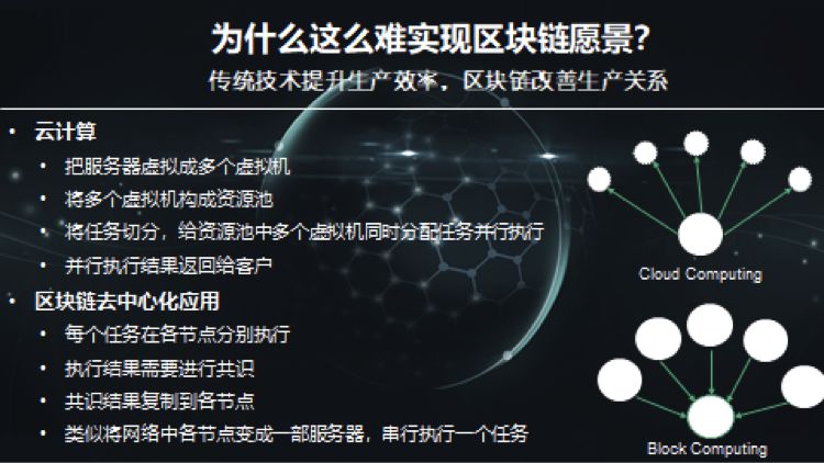 这个愿景为什么这么难实现?恰恰回到刚才区块链的本质是分布式的确定性有限状态共识的有限状态机,我们来看,拿它跟云计算做比较,我们发现它有很大的不一样。