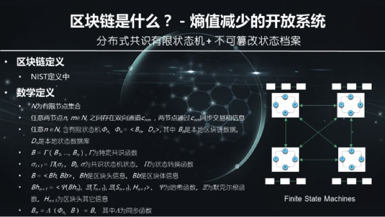 我们认为区块链是个比较有意思的系统,如果从热力学第二定理来看,是熵值减少的开放系统。我们认为区块链是一个分布式的确定性共识有限状态机,再加上不可篡改的状态档案,这个是区块链比较接近它本质的东西。如果说定义的话,目前来看,最精确的定义是以太坊黄皮书里面,它实际上完全用数学语言描述了以太坊,任何公司按照黄皮书可以完全的去实施实现一个以太坊的节点,那个是准确的一个定义。