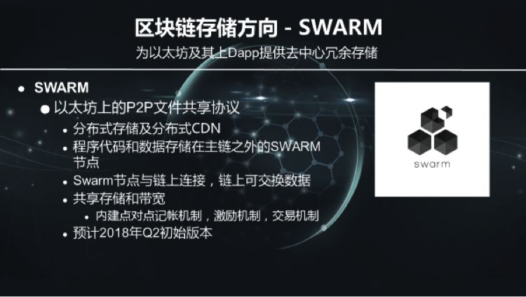 第二个去中心化的存储,这一块还在继续开发中的Swarm;