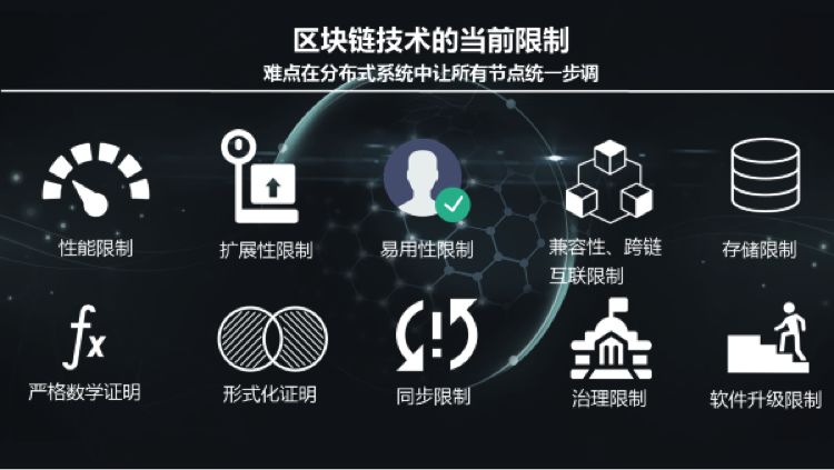 我们现在总结一下,目前区块链技术在当前这个不完美世界一些限制,难点主要是在分布式系统里面所有的节点步调一致,体现在第一个大家熟知的就是性能限制,大家都在讨论多少tps才能支撑应用。