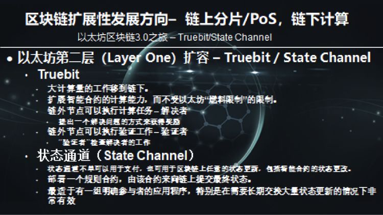 TrueBit是另一个链下扩容方案,通过外包方式把大的计算任务和验证认为转移到链下。状态通道则在原先支付通道的基础上,进一步支持智能合约,管理“世界状态”。
