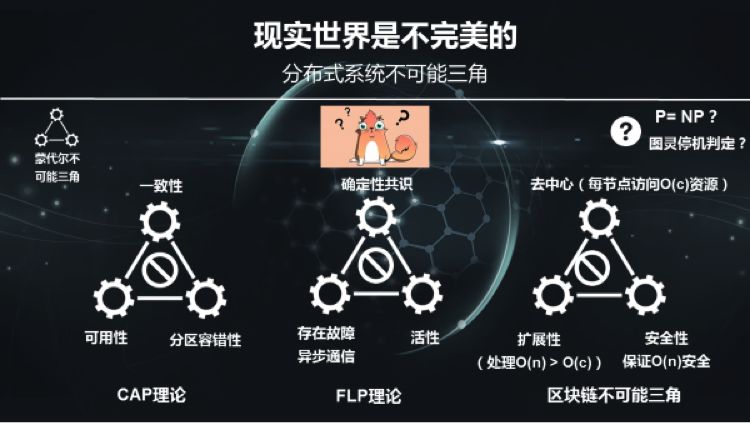 我们说现实世界确实是不完美的,刚才我们也看到,而且特别是对分布式系统它存在所谓不可能三角。包括我们看到经济系统有蒙代尔不可能三角,大家也知道在分布式处理里面我们也有CAP的理论,可用性、一致性、分区容错性,三者取二,不能得兼。