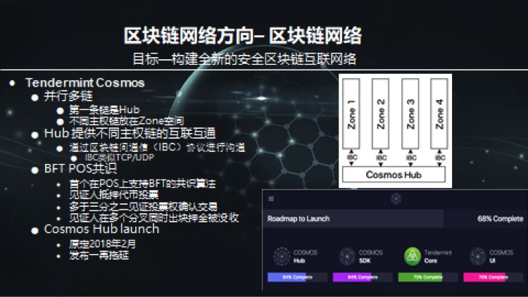 Tendermint Cosmos也是区块链的网络,Tendermint第一个提出支持拜占庭容错的POS共识算法,Cosmos通过Hub来对并行多链做跨链整合。