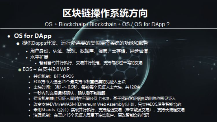 首先最早应该算是EOS提出区块链操作系统的概念,到底它的含义是什么?是我们传统的操作系统加上区块链,加区块链的功能?还是我们现在说的区块链+,去加传统的操作系统?还是最后它实际上很简单,就是一个支持Dapp的操作系统?我们更相信是最后这个支持Dapp的区块链操作系统。