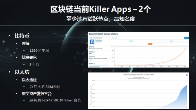 很多人认为目前区块链是炒作,没有落地应用,杀手级应用只有一个,就是比特币。我们认为稍微乐观一点,目前杀手级应用应该有两个。一个是比特币,一个是以太坊。
