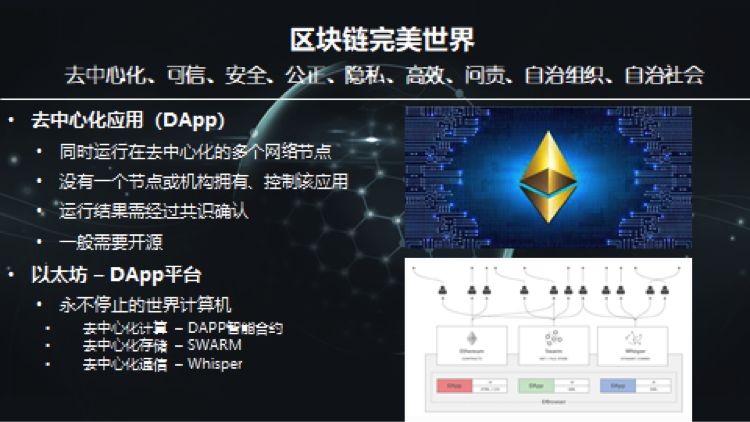 我们每个人出生希望这个世界是个完美的世界,美国有美国梦,中国有中国梦,确实有美好的事情,美好的东西。区块链的完美世界是什么呢?区块链的完美世界我们叫去中心化的可信、安全、公正、可以保护隐私、高效、可问责、自治组织,甚至自治社会。这里面有个比较重要的概念叫去中心化的应用,这跟我们传统的应用有比较大的区别。