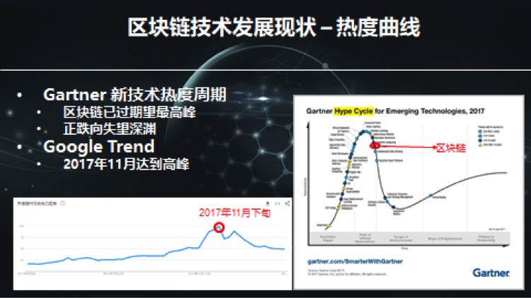从宏观的局面来看一下区块链技术发展,现在的阶段,第一个Gartner新技术热度周期大家比较熟悉。可以看到区块链在去年7月份的时候已经走向下坡路,未来可能会跌向失望的深渊,明年这个时间相信今天的会就不会有今天这么多人了(开玩笑),这是现在的预测。