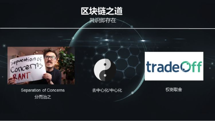 时间关系,很多方面不能讲得太细。最后是区块链未来发展的思考,区块链之道,在区块链上面是共识即存在,只有共识才被认可,架构上面我们做到分而治之。第二个是传统的中国的哲学,不要走极端,去中心化和中心化是阴阳互补,最后要根据应用需求在去中心、安全性和扩展性上做权衡取舍,不能所有的都要。这才是解决区块链受不完美世界限制的唯一方法。