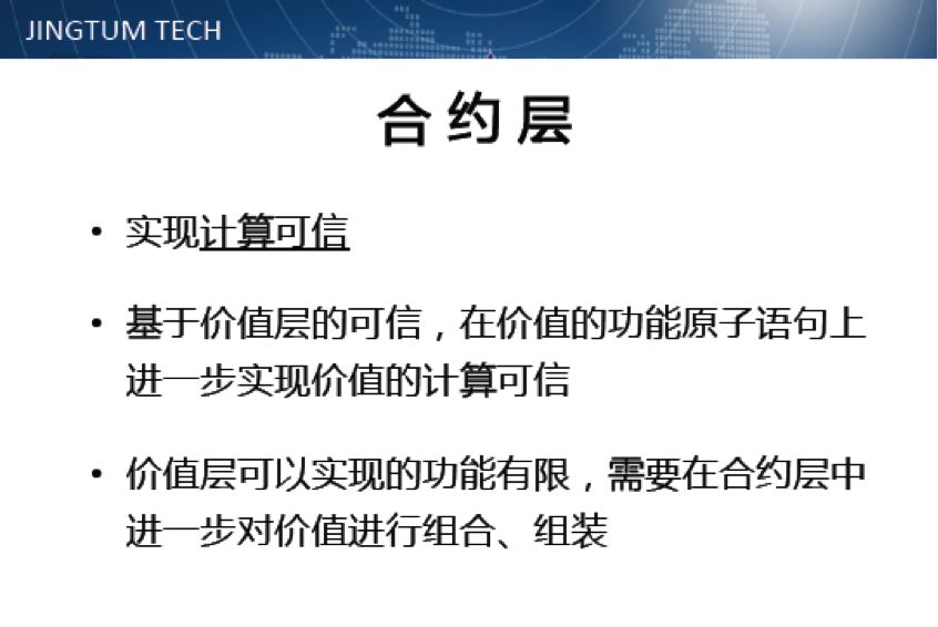 再往上一层是合约层,价值可信里能做的还是比较有限,合约层要实现计算可信,计算可信是做计算不依赖某一个节点,是依赖整体的系统,某一个节点故障可信不可信其实不影响计算的结果,所以我们提的是计算的可信。