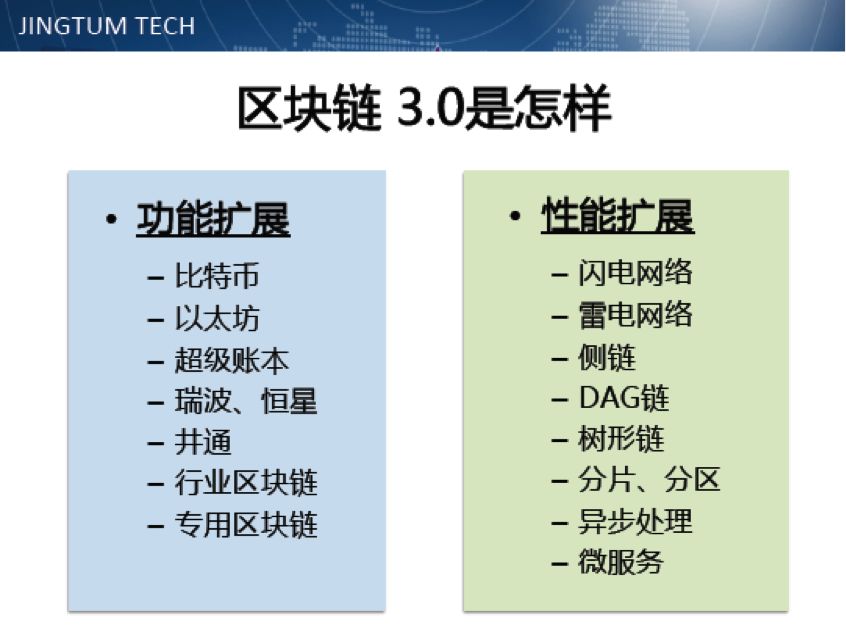 井通是一个进化中的公司,区块链已进入3.0阶段,很多行业都提了新的3.0区块链概念,这个概念其实是没有整体性的创新,以太坊也不是很创新。3.0阶段一方面是功能性扩展,提供更多的性能,做资产的交易等;另一方面是性能扩展,无论是功能还是性能,都有新概念的提出。