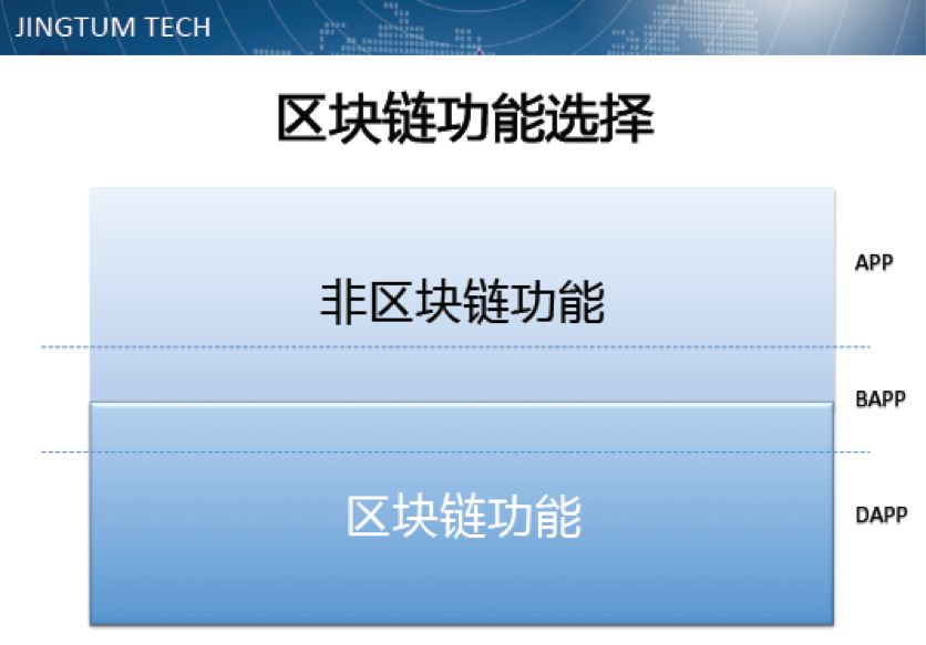 区块链的功能分几部分,比如数据交换、分布式、去中心,可以把整体功能打包到区块链,再做分布式存储和交换,这里其实是切割,是你把这条线切在哪里的问题,你往下切做的更轻一些,往上切做的更重一些,应用特性更明显一些,所以我们做的是比较中间的切法,往上是做的是APP中间做的是BAPP,往下是DAPP,它完全是一个去中心的应用。