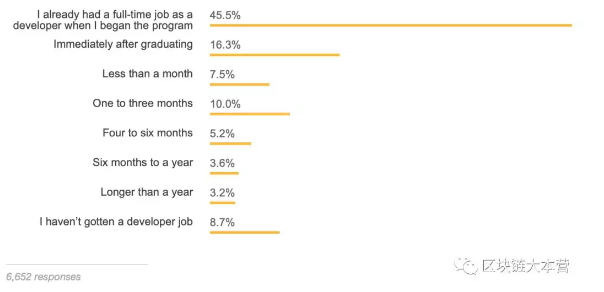 16%的参与者,在训练营结束之后立刻找到了开发工作;近40%,在半年内开启了自己作为开发者的职业生涯——如果你是学生,这类培训的效果明显;不过,45%的参与者,本身就是有经验的开发者,他们通过这样的活动升级自己的技能树。