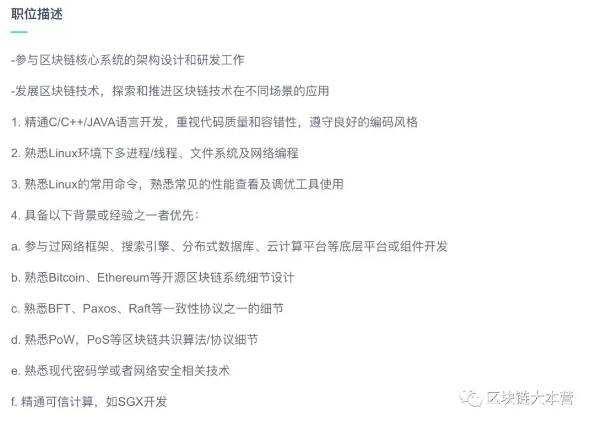 对区块链工程师的技能要求主要包括,网络、数据库设计、密码学,编程语言方面多种多样——Java、JavaScript、C++、Go、Solidity 和 Python 都是常见选择。最值得关注的是,当下对职位的需求主要源自大型IT公司,它们开始将区块链技术应用于项目,例如 Facebook、亚马逊、IBM和微软,都有对区块链工程师的需求。国内,情况也发着类似的转变。越来越多的“正规军”正在拥抱区块链技术。