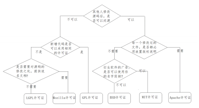 BSD是一个开源的许可证,世界上的开源许可证有很多,现在比较流行的有六种分别是GPL、BSD、MIT、Mozilla、Apache、LGPL。这六种的区别是什么,我们可以通过下面一张图来解释下: