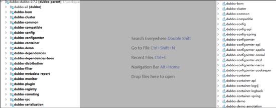 可以看到Dubbo被拆分成很多的Maven项目,在后续课程中会介绍左边每个模块的大致作用。