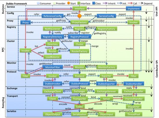 - 图中左边淡蓝背景的为服务消费方使用的接口,右边淡绿色背景的为服务提供方使用的接口,位于中轴线上的为双方都用到的接口。