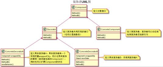 - Decorator:抽象装饰者,继承自Component,从外类来扩展ConcreteComponent。对于ConcreteComponent来说,不需要知道Decorator的存在,Decorator是一个接口或抽象类