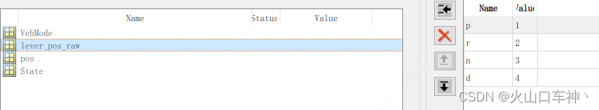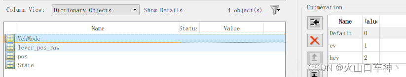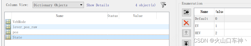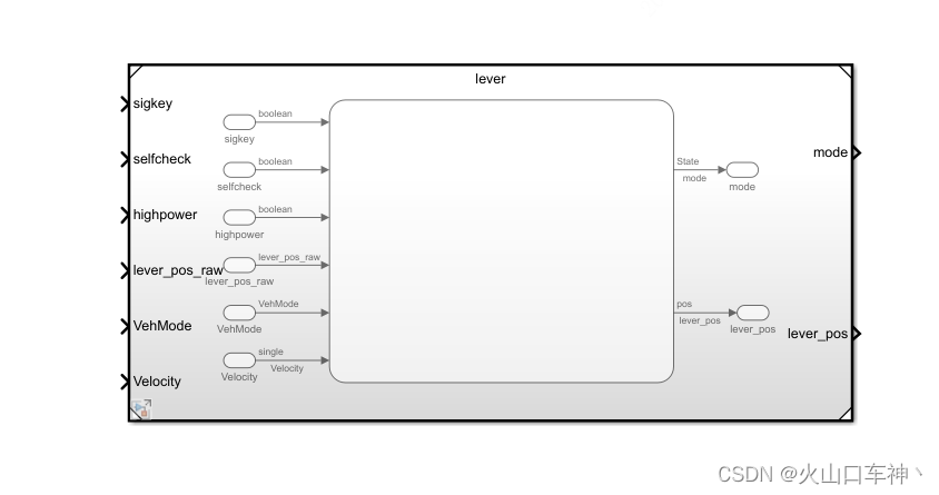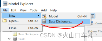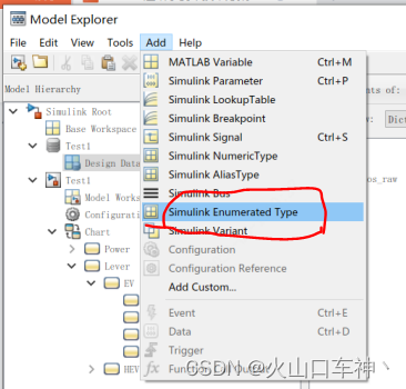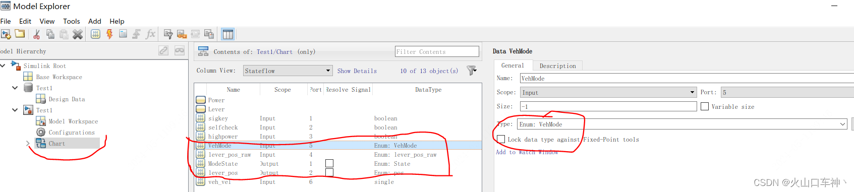 模型内的输入及输出量需要在Model Explorer进行定义,也就是说除了sldd中定义的那几个枚举量,在本处也需要再定义一次,不然状态机将无法识别,此处上述枚举量定义时关键点是变量的数据类型的选取,由于sldd中已经定义,所有在数据类型下拉中会出现