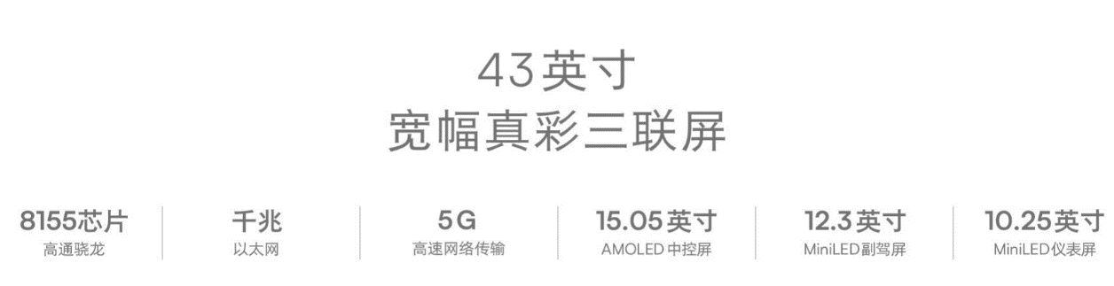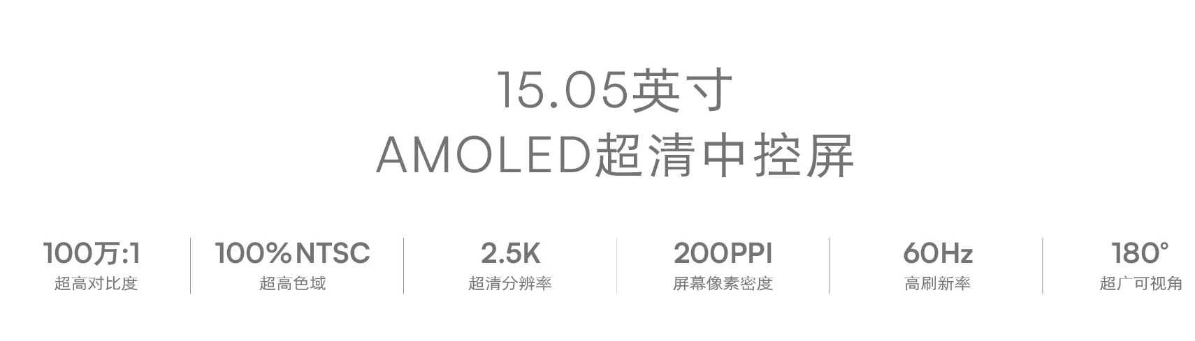 还有智能座舱的硬件,43英寸三联屏,中间是一块15英寸AMOLED显示屏,这块屏幕显示素质看参数是相当高了,2.5K分辨率显示细腻(2560*1600,PPI 201),100% NTSC 超高色域色彩艳丽,1000000:1 超高对比度色彩纯净,四百万像素自发光,更有高刷新率和宽可视角加持,光影流动,丝般顺滑,但用难回。