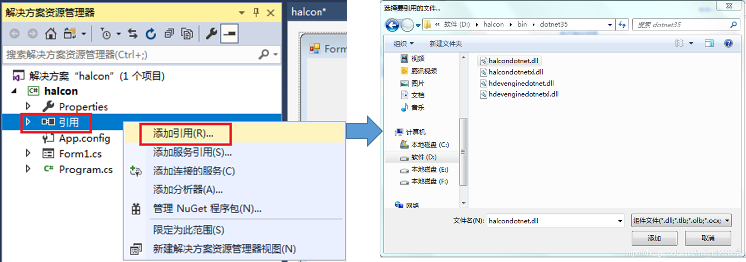 第一步,添加引用。在解决方案资源管理器中选择【引用】,单击右键,选择【添加引用】,在halcon安装目录,bin文件夹下找到“halcondotnet.dll”文件,选择【添加】。