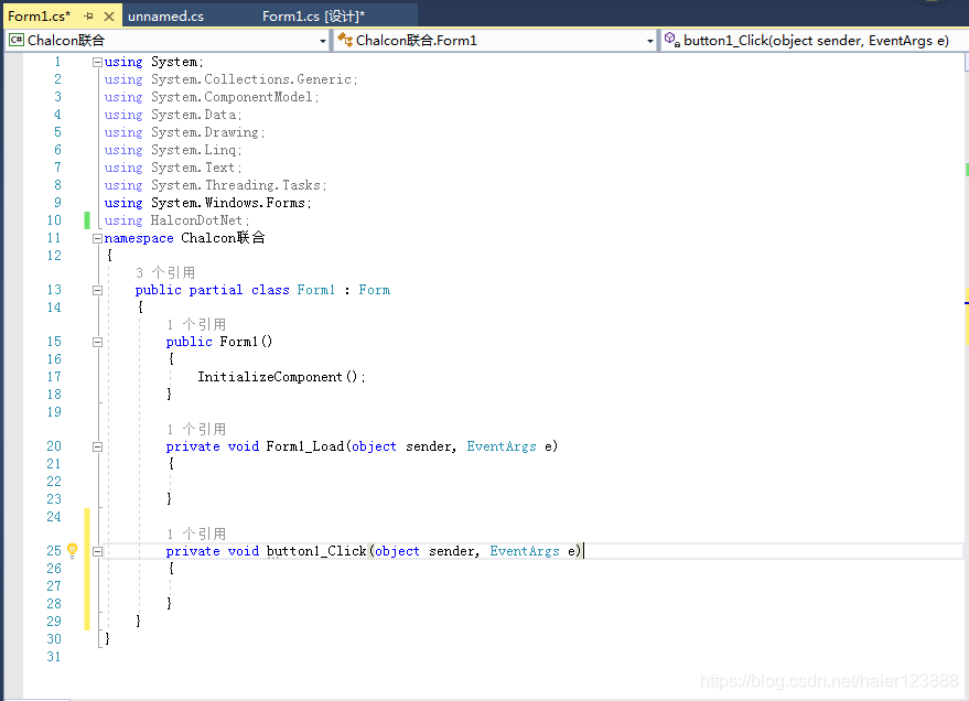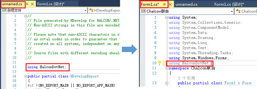 11、加入命名空间。在C#中,我们用的是格式是“using”,在halcon生成的程序中可以看到“using HalconDotNet”,选择并复制。打开“form.cs”程序,粘贴复制的程序。
