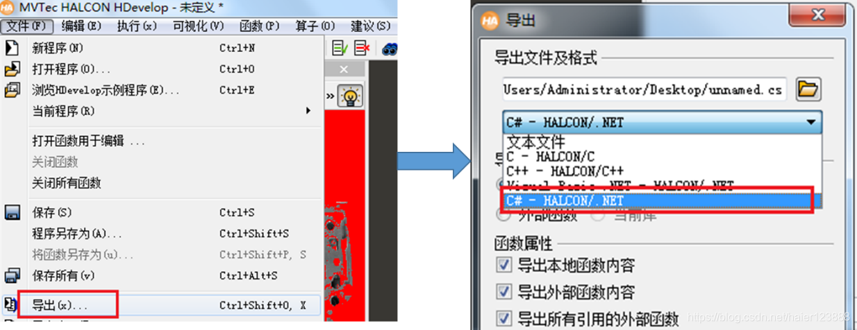 4、生成C#程序。选择菜单栏【文件】→【导出】,弹出导出界面,选择导出文件类型“C#”,确定。