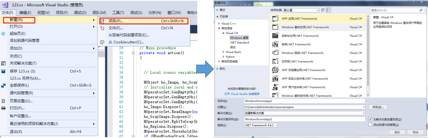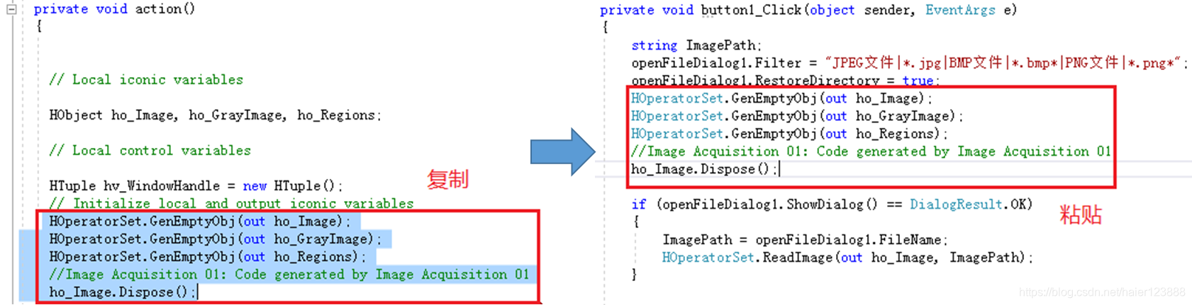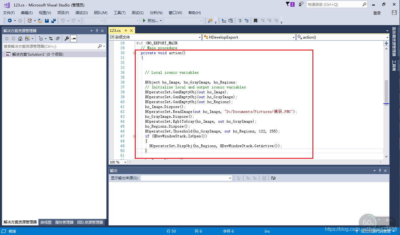 5、双击打开生成的C#文件,action函数中额内容即为halcon中实现的。