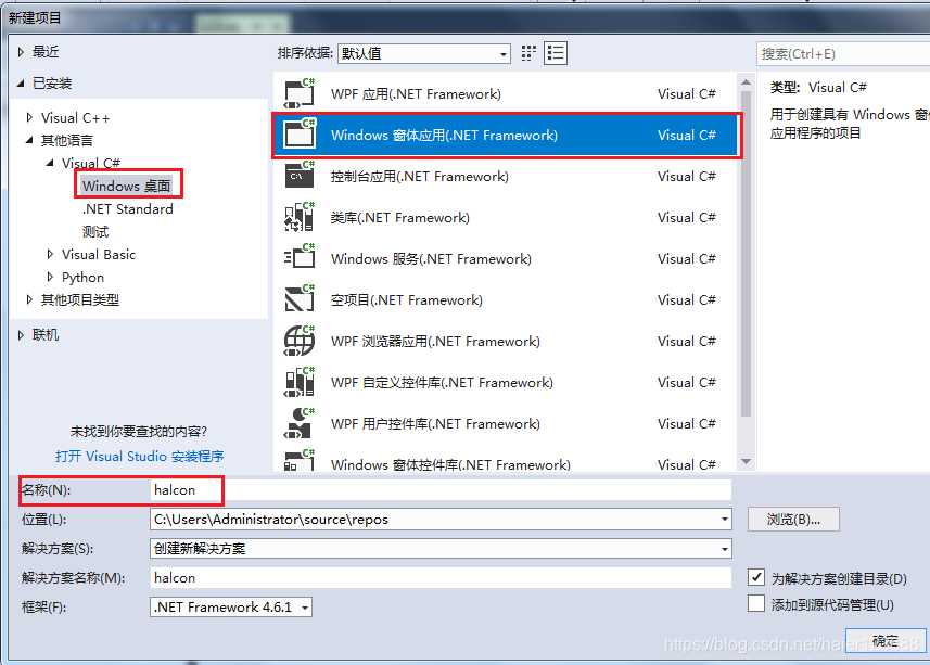 7、选择【其它语言】→【visual C#】→【windows 窗体应用】,修改文件保存名称,确定。