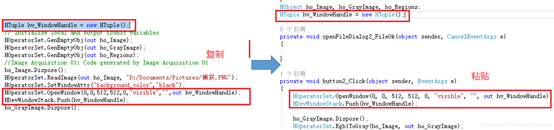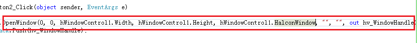 此处需要注意,必须首先打开窗口,打开的窗口需嵌在前面显示的框里,打开窗口的函数在halcon软件中输入“dev_open_window(0, 0, 512, 512, ‘black’, WindowHandle)”,重新生成C#程序。