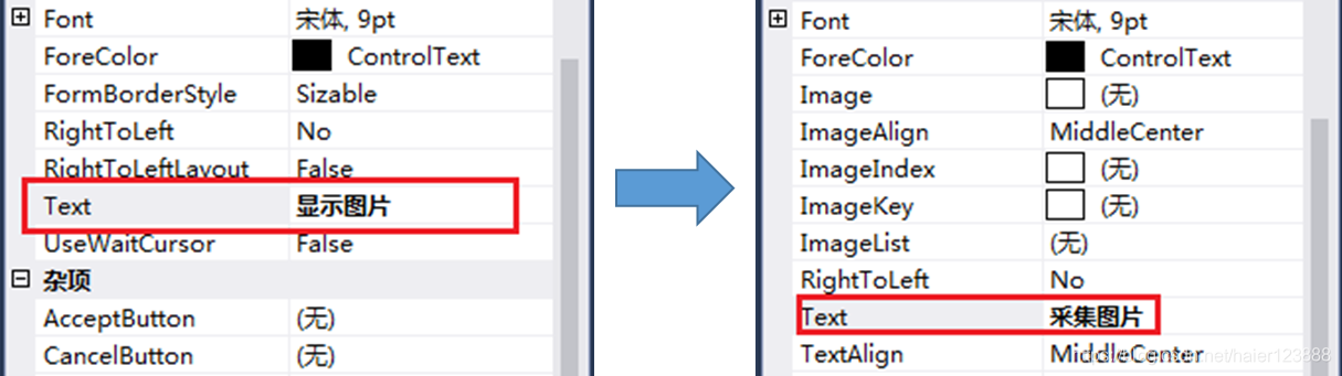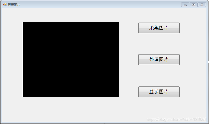 17、在form1界面上空白处单击右键,选择【属性】,在text中输入“显示图片“;选中button1,单击右键选择属性,在text中输入”采集图片“;同理分别修改button2和button3的名称为“处理图片“和”显示图片“。