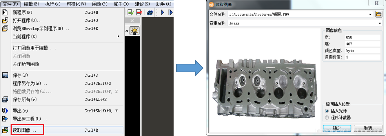 1、新建halcon程序,读取图像并二值化图像。选择菜单栏中的【文件】→【读取图像】,选择图像打开。