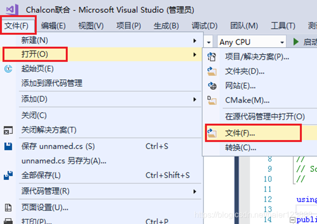 10、打开halcon生成的c#程序。选择菜单栏中的【文件】→【打开】→【文件】,打开文件。