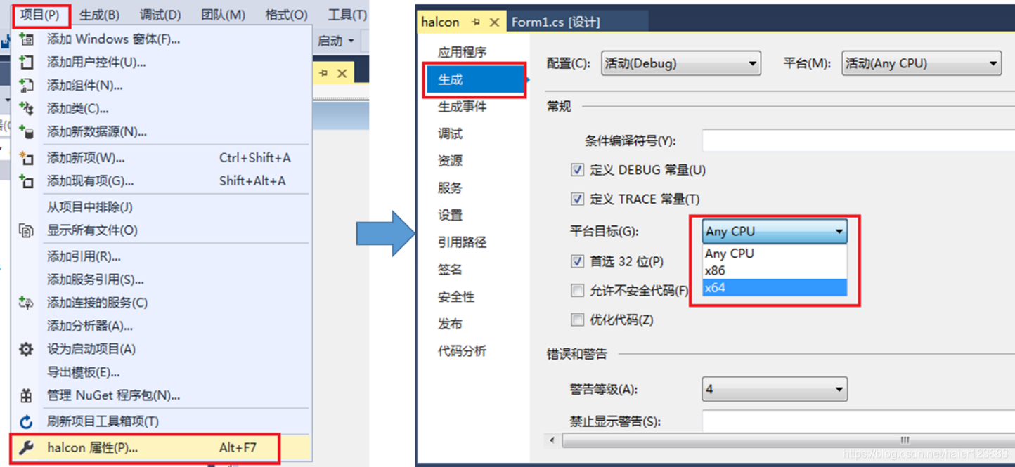 8、选择CPU类型。选择菜单栏中的【项目】→【属性】,弹出配置界面,选择【生成】,CPU类型根据自己的电脑类型选择。