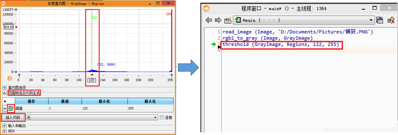 2、图像二值化之前,需要对图像进行灰度化处理,写入程序“rgb1_to_gray (Image, GrayImage)”,运行程序。选择【打开灰度直方图】,弹出“灰度直方图”界面。选择【范围筛选及代码生成】→【阈值】,移动阈值线至合适的位置,选择【插入代码】,关闭窗口。