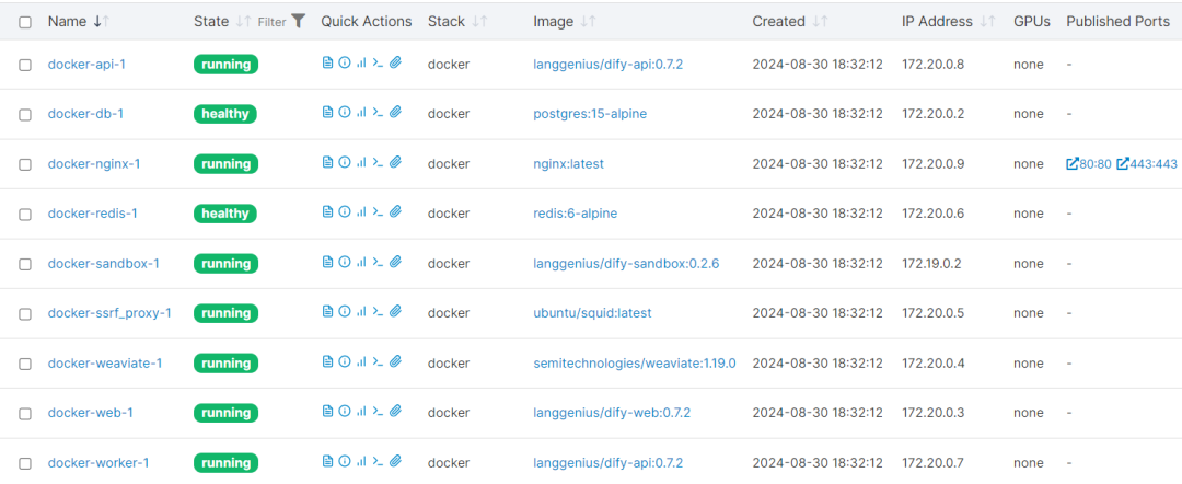稍等片刻,我们就会看到Docker已经运行起来9个容器:有web、缓存、数据库等。