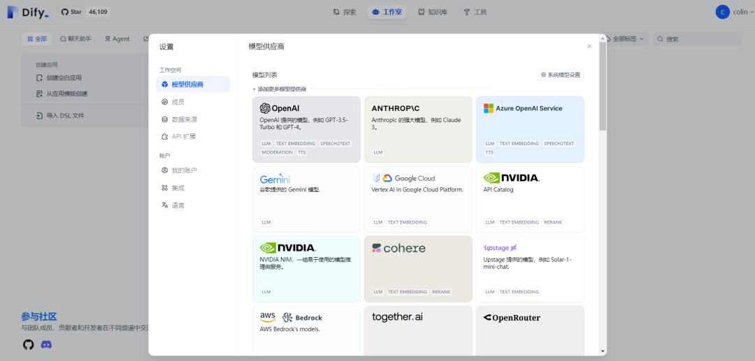 点击右上角用户名下的设置菜单,选择模型供应商,我们看到这里支持多种模型接入,我在这里只演示接入OpenAI模型。