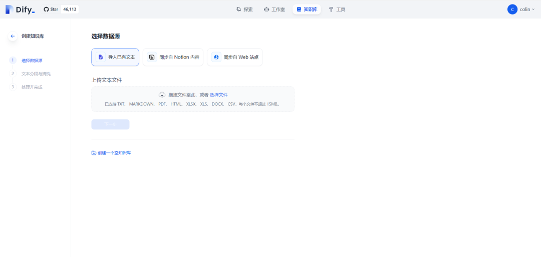 回到主页面,在知识库区域,我们可以上传自己的数据。