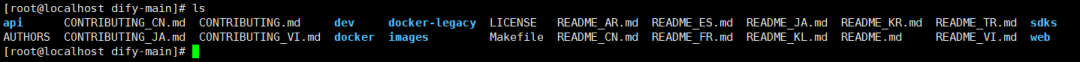 Dify部署需要有Docker运行环境,我使用的是Linux系统的Docker运行环境,把dify-main.zip放入Linux系统文件夹,执行 unzip dify-main.zip,下图为解压后的文件信息: