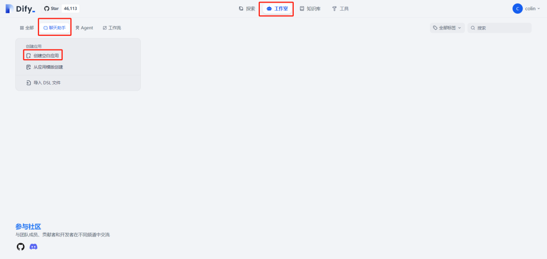 选择 工作室->聊天助手->创建空白应用